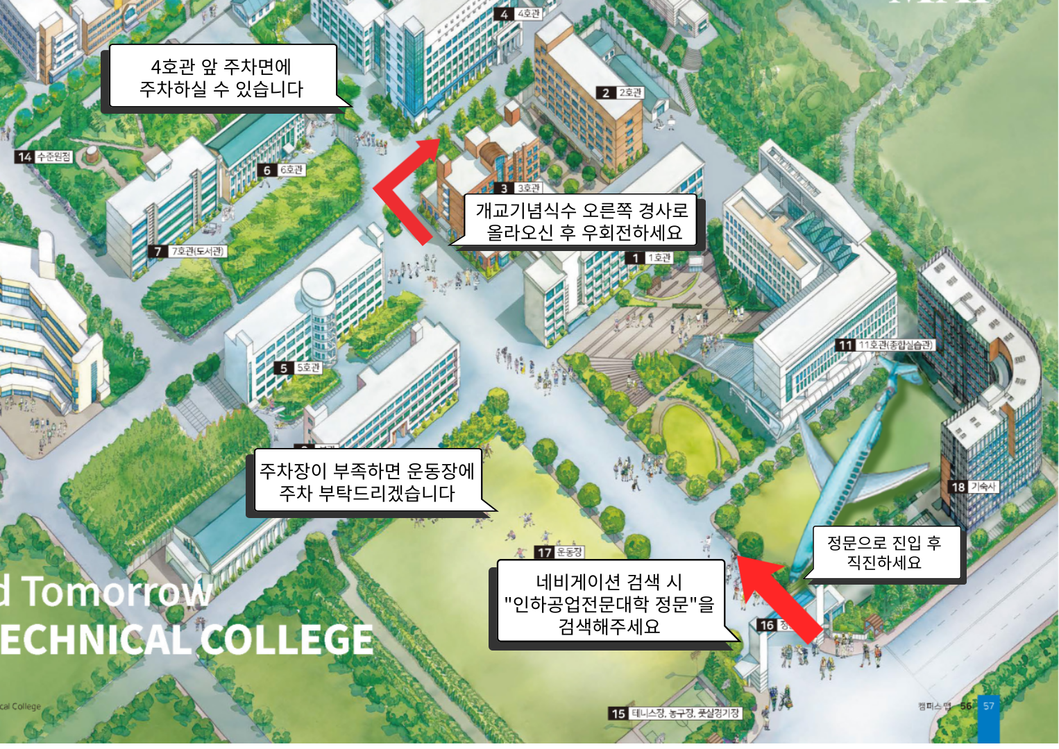 - 주차는 본교 운동장 또는 4호관 앞 주차면 이용